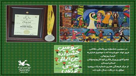 کیمیا روزبهانی عضو کانون‌پرورش‌فکری‌کودکان‌ونوجوانان استان لرستان در سومین جشنواره بین‌المللی نقاشی «روز تولد خورشید» که با موضوع «باران» برگزار شد؛ عنوان برگزیده را کسب کرد.